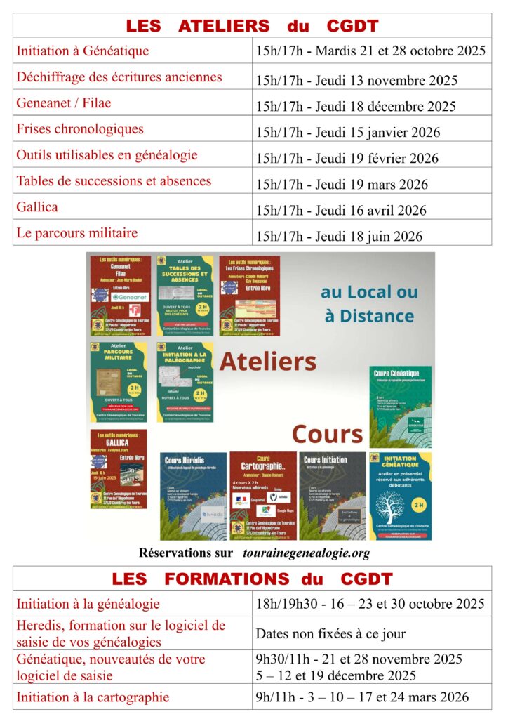 Pour chaque atelier, s’inscrire obligatoirement auprès du Centre Généalogique de Touraine (voir actualité dédiée dans le diaporama). Ateliers ouverts et gratuits pour nos adhérents et avec une participation de 10 € pour les extérieurs.