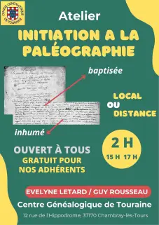 Pour chaque atelier, s’inscrire obligatoirement auprès du Centre Généalogique de Touraine (voir actualité dédiée dans le diaporama). Cours réservés (gratuitement) à nos adhérents.