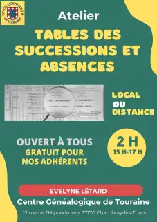 Pour chaque atelier, s’inscrire obligatoirement auprès du Centre Généalogique de Touraine (voir actualité dédiée dans le diaporama). Ateliers ouverts et gratuits pour nos adhérents et avec une participation de 10 € pour les extérieurs.